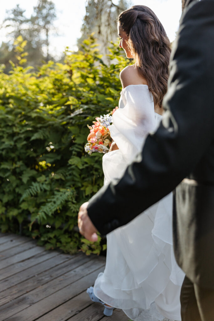 The couple exchanged vows surrounded by towering trees, colorful flowers, and the peaceful atmosphere VanDusen is known for. The natural light filtered perfectly through the branches, giving their ceremony a warm, romantic glow.